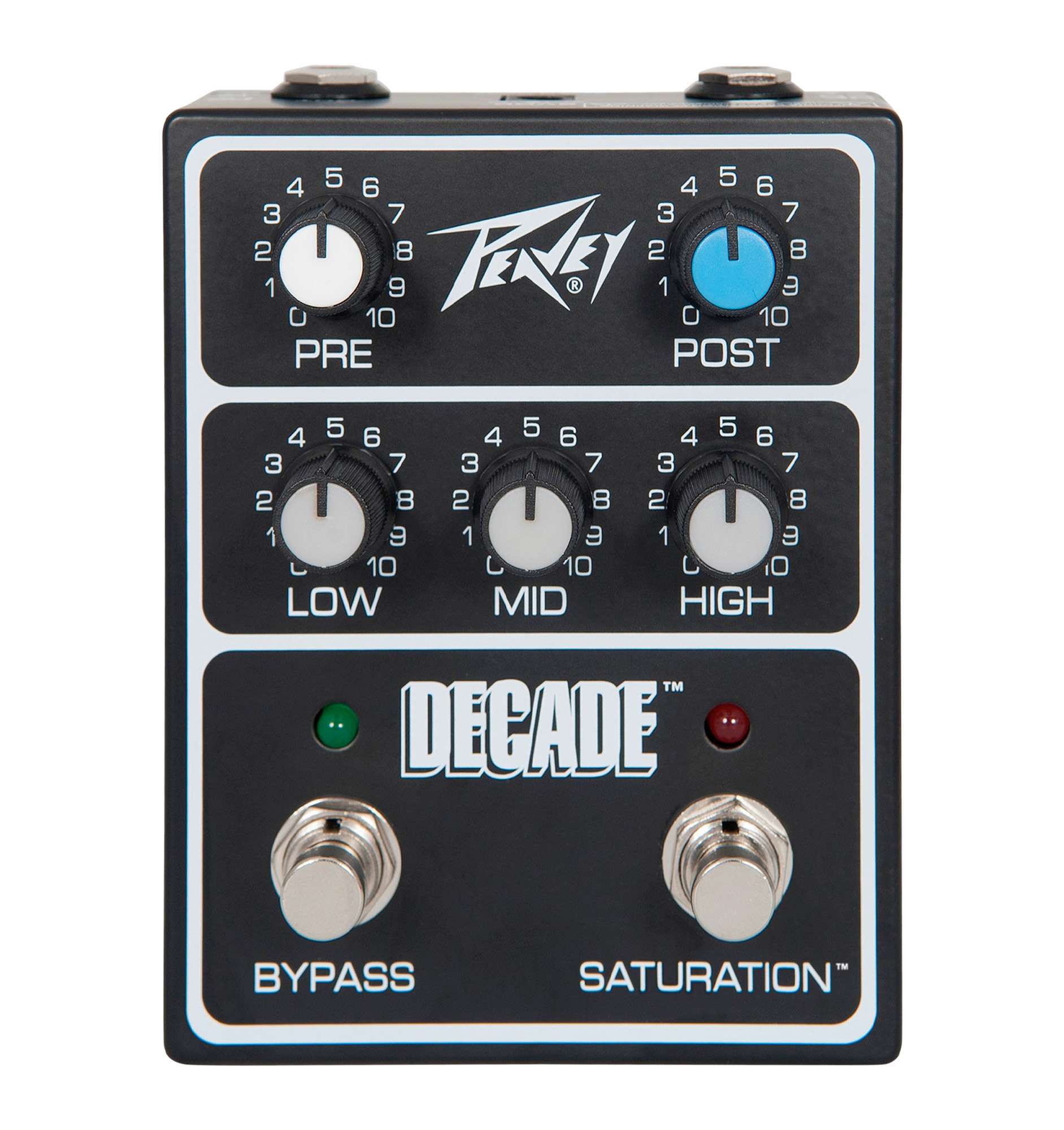 Pédale préampli Peavey Decade, circuit vintage 1980, canal Saturation, EQ 3 bandes, alim 9V interne 24V, bypass silencieux